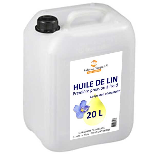 Nous proposons à la vente l’huile de lin produite artisanalement en “première pression à froid”, que nous utilisons pour le traitement de nos ruches. Nous la conditionnons en bidons de 5 litres ou bidons de 20 litres.